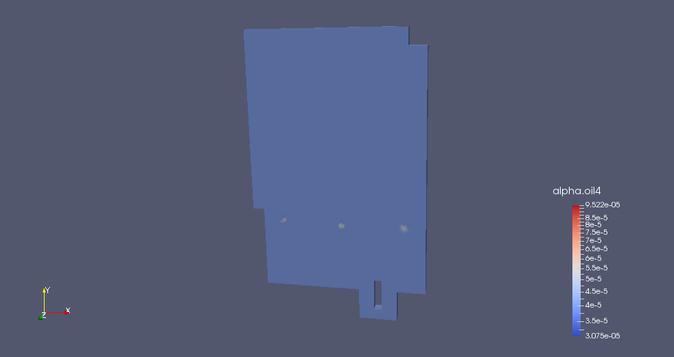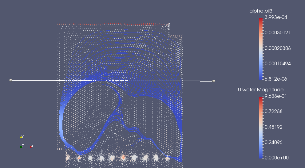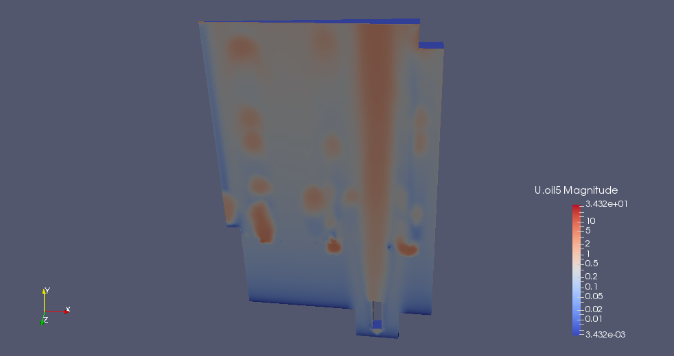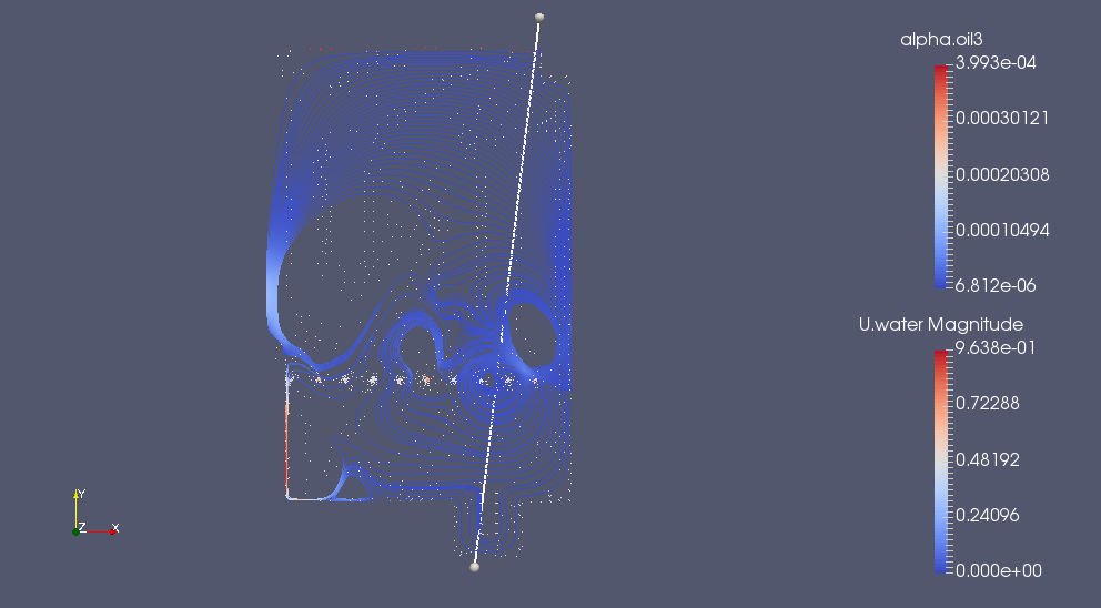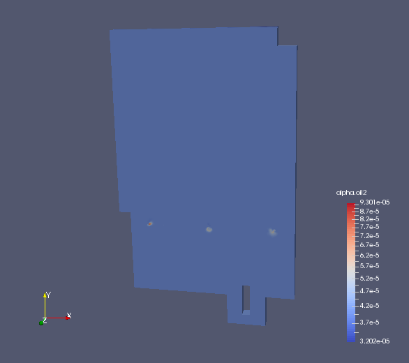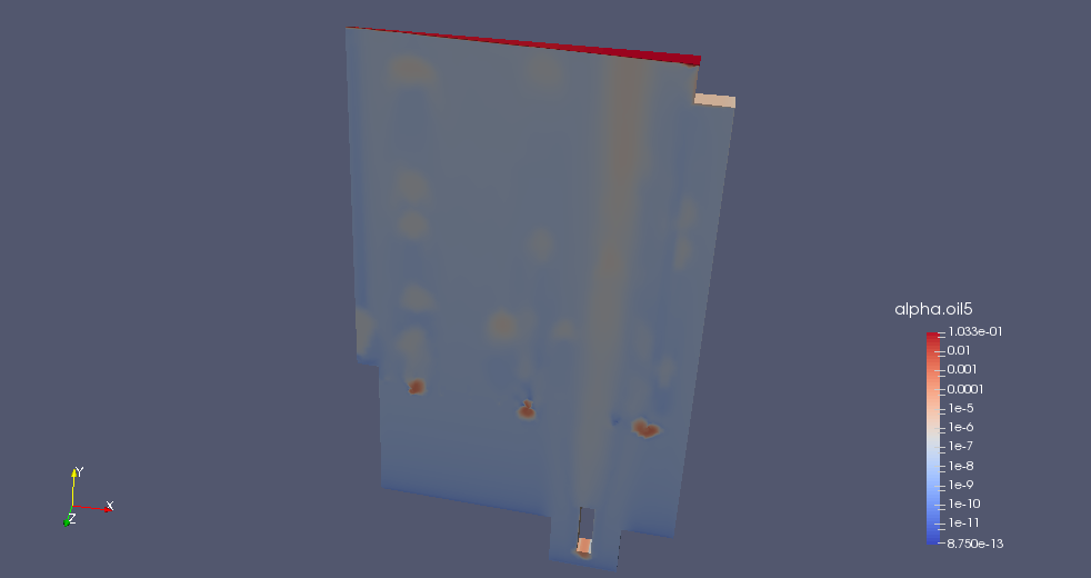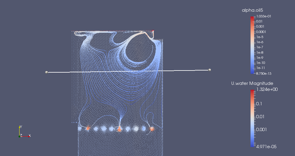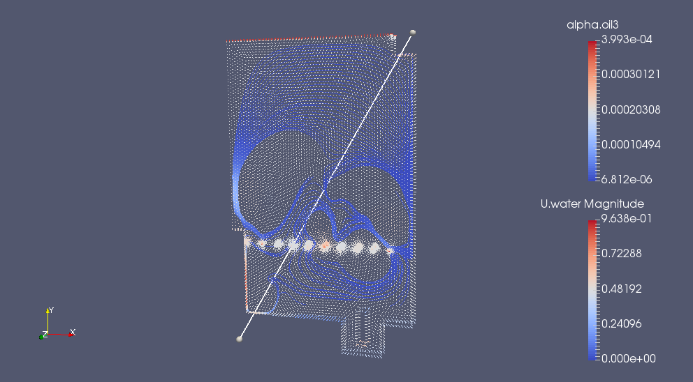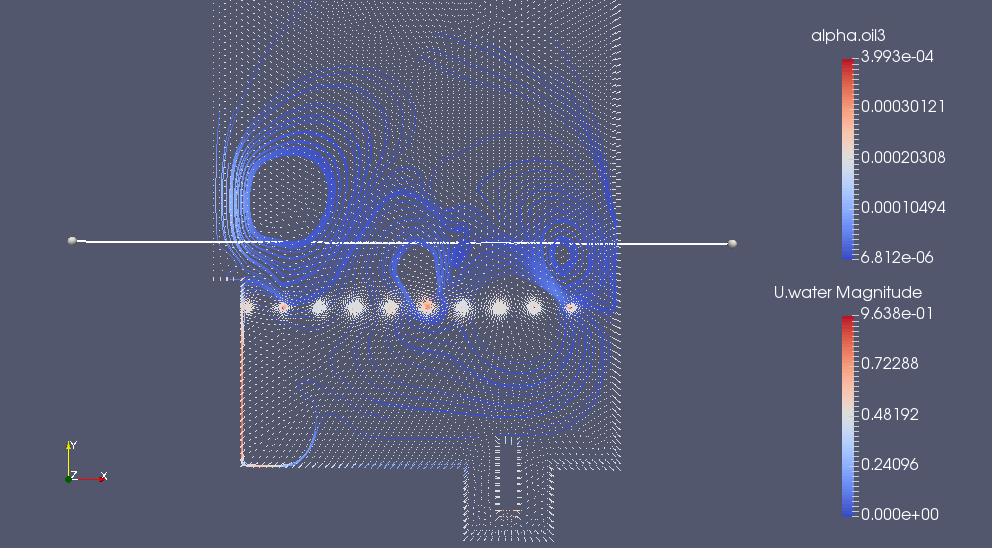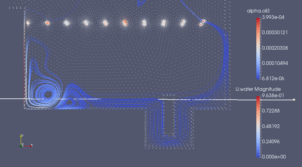 Este caso corresponde a la simulación CFD multifásica que contiene una fase de agua y 5 fases de crudo, cada una para un tamaño de gota. Teniendo en cuenta la complejidad de este modelo el tiempo de proceso simulado al momento de la elaboración de este informe era de 5.71 segundos. La gravedad se aplicó como una carga de cuerpo de -9.81 m3/s2.