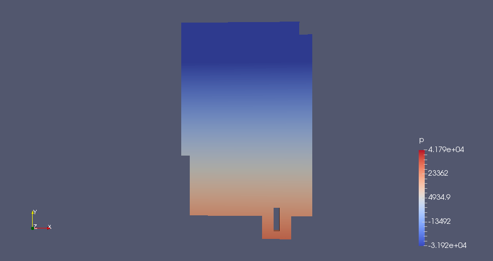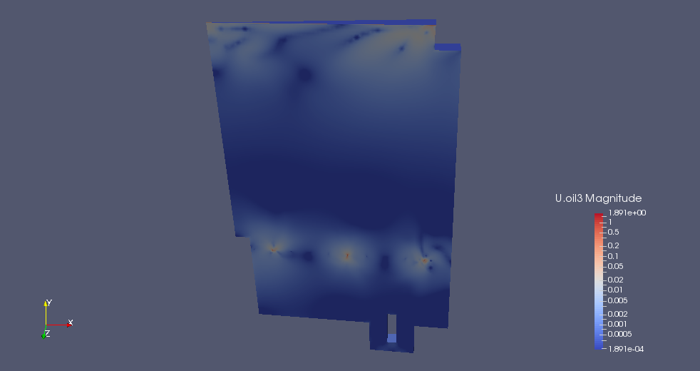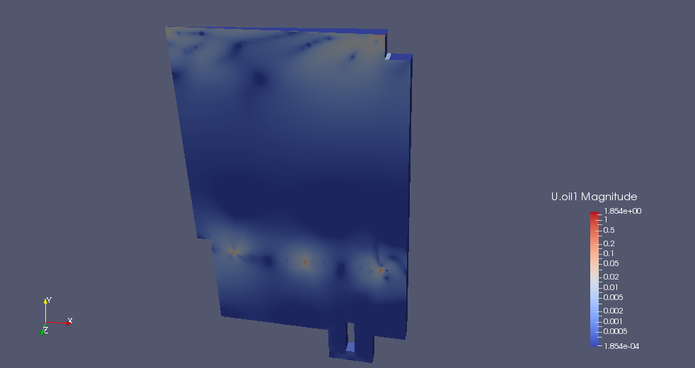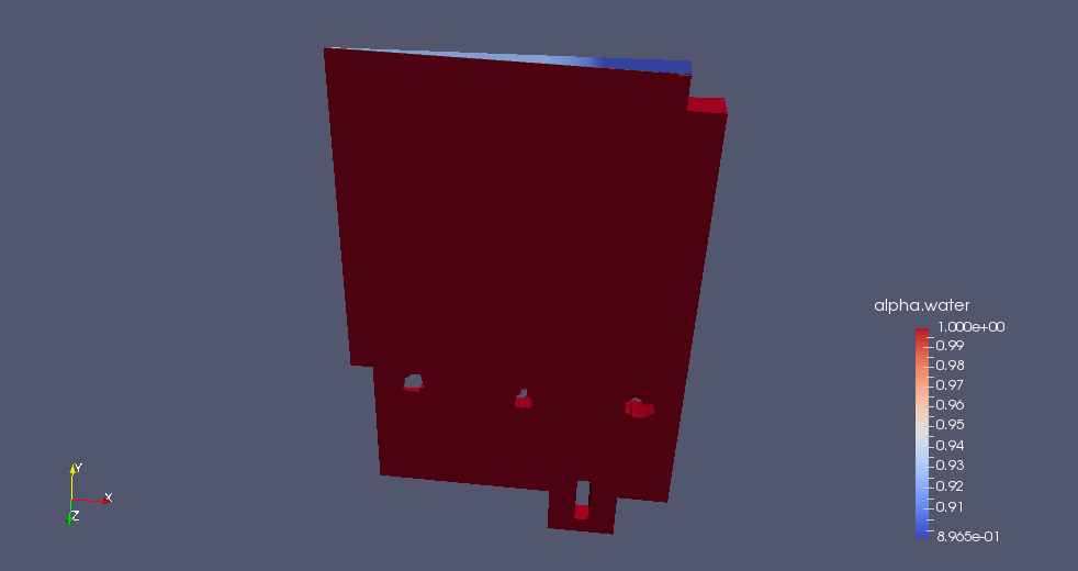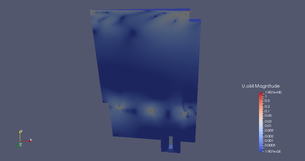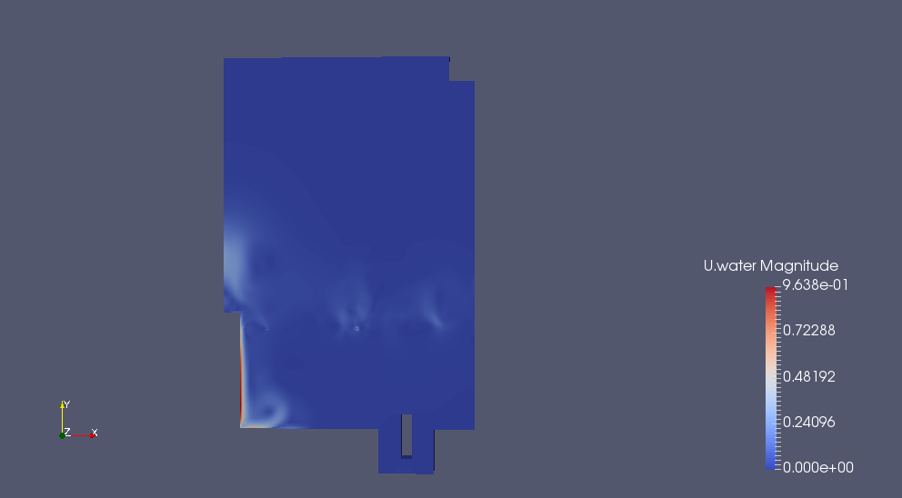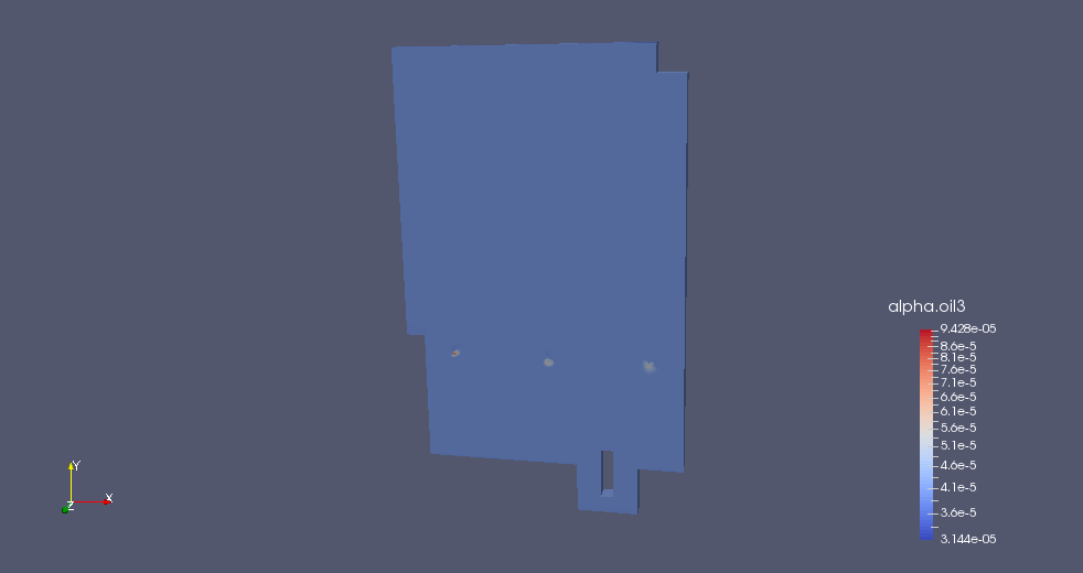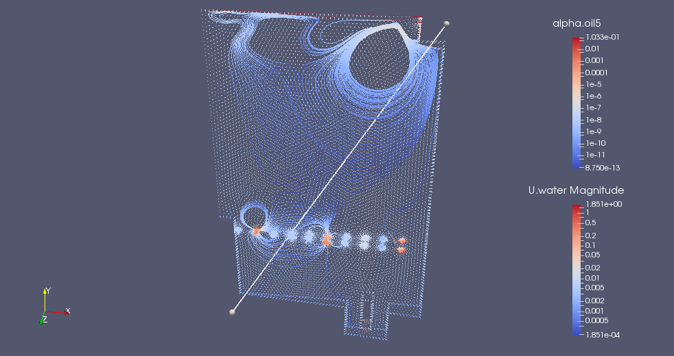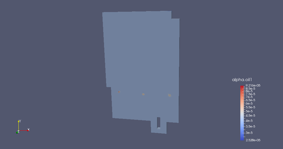 Este caso corresponde a la simulación CFD multifásica que contiene una fase de agua y 5 fases de crudo, cada una para un tamaño de gota. Teniendo en cuenta la complejidad de este modelo el tiempo de proceso simulado al momento de la elaboración de este informe era de 5.71 segundos. La gravedad se aplicó como una carga de cuerpo de -9.81 m3/s2.