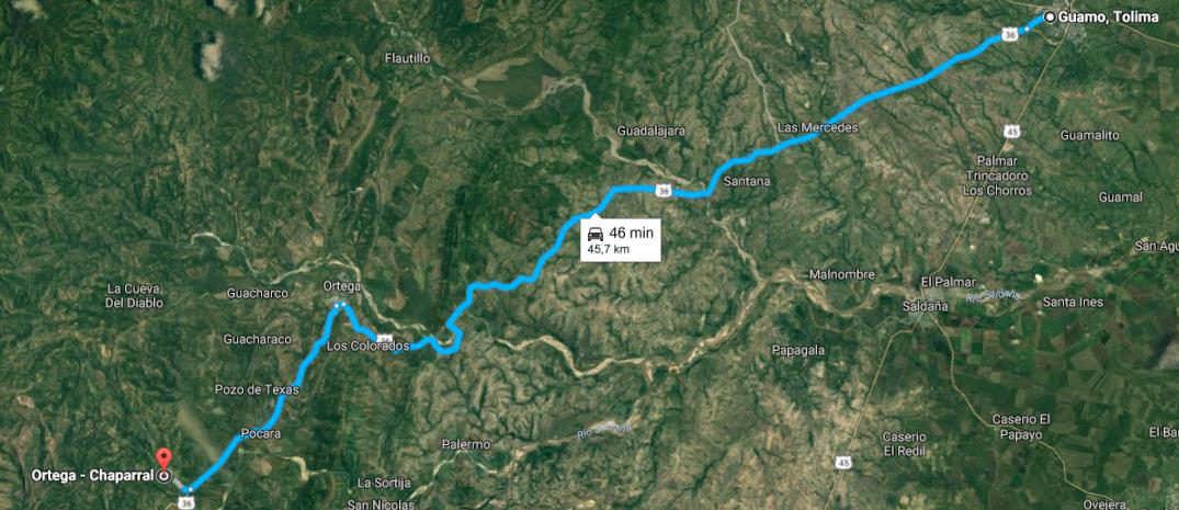 Para llegar a la batería se debe seguir la ruta Bogotá – Neiva y después del municipio del Guamo tomar la vía hacía el municipio de Ortega, recorriendo una distancia aproximada de 46 km hasta llegar a Toldado, tal y como se ilustra en la figura 3.