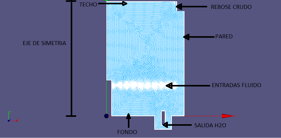 La aproximación axisimétrica modelada representa un corte perpendicular del tanque comprendido entre el eje central del tanque y la pared del mismo, la aproximación numérica predice el comportamiento de un tanque que corresponde a la rotación de esta sección. En este sentido el modelo aproxima de manera cercana el rebose de la salida de Crudo, aproxima las entradas al equipo como anillos y no como los brazos del equipo real (Ver Figura 1.) y aproxima la salida del agua como un anillo perimetral. Para el análisis se tendrá en cuenta y aclarará la aproximación utilizada.